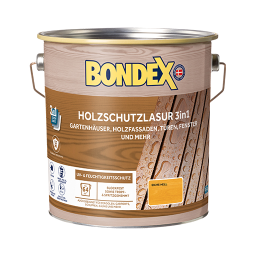 BONDEX HOLZSCHUTZLASUR 3in1 ist eine vielseitige, wasserbasierte Holzlasur, die Grundierung, Filmschutz und Endbeschichtung in einem bietet. Ihre tropfgehemmte, blockfeste Formel schützt alle Holzarten vor UV-Strahlen und Wettereinflüssen im Außenbereich.