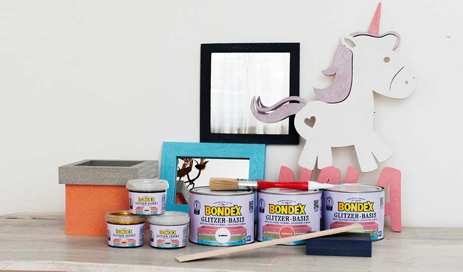 Tolle Glitzereffekte kann man durch das Mischen verschiedener Glitzereffekt-Kombinationen verstärken. Mit Bondex Glitzerbasis und Glitzereffekt könnt Ihr frei wählen, wie stark Eure Holzmöbel glitzern sollen.